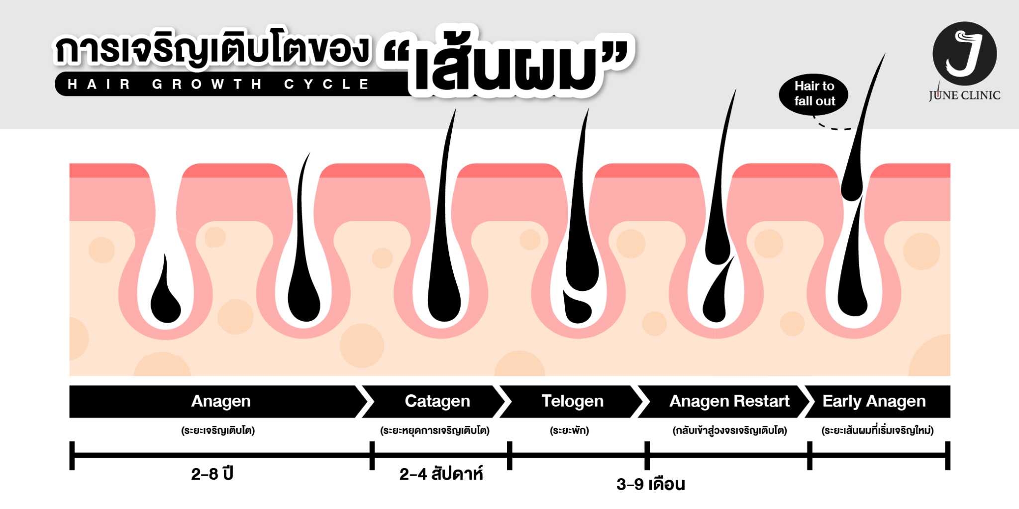 ข้อควรรู้ การเจริญเติบโตของเส้นผม เส้นผมของคนเราโดยเฉลี่ยแล้วจะมีเส้นผมประมาณ 100,000-150,000 เส้น แล้วแต่ละบุคคลแล้วแต่กรรมพันธุ์ของแต่ละบุคคล บางคนหนา บางคนบาง ขึ้นอยู่กับการดูแลและเอาใจใส่ของแต่ละคน แต่สิ่งที่เหมือนกันในมนุษย์ทุกคนคือ วงจรชีวิตของเส้นผม ซึ่งทุกคนล้วนเหมือนกัน เกิดขึ้น คงอยู่ และจากไป โดยใน 1 วันตามปกติแล้ว เส้นผมของคนเราจะร่วงประมาณ 100-150 เส้นเป็นปกติ นอกจากเกิดความผิดปกติ ซึ่งไป ตรงกับ ” สาเหตุของผมร่วง ” ซึ่งมีหลายสาเหตุ หลายปัจจัย วงจรชีวิตของเส้นผม หลักๆแล้ววงจรชีวิตของเส้นผมจะแบ่งออกเป็น 4 ระยะ ตลอดช่วงชีวิตคน อธิบายได้ดังนี้ ระยะแรกของวงจรเส้นผม Anagen (ระยะเจริญเติบโต) (Growth phase) ระยะนี้ จะเป็นระยะที่เซลล์ผมเริ่มแบ่งตัวโดยจะใช้เวลาอยู่ที่ 2-8 ปี ซึ่งระยะนี้จะเกี่ยวกับกรรมพันธ์โดยตรง โดยจะสร้างผมขึ้นมาใหม่และจะผลักเส้นผมเดิมออกไป(ผมที่ไม่เจริญเติบโตแล้ว) ให้หลุดออกไป ในเฟสนี้เส้นผมจะยาวขึ้น 1 cm.ทุกๆ 28 วัน ระยะที่สอง Catagen (ระยะหยุดการเจริบโต)…